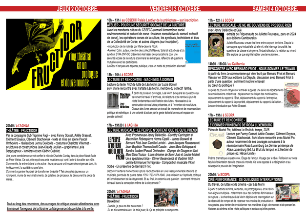 Ouverture à l’Aghja avec le ring théâtral Fructidor joué à deux reprises en plein feu et en quadrifrontal ; une pièce d’amour, une pièce politique, inspirée par Bernard Friot, économiste et sociologue du travail, qui nous fait cette année encore, l’immense joie de sa présence, avec notamment une rencontre intitulée Nous sommes le Travail ; et à ce propos, notre camarade Aurélien Catin poursuivra une réflexion engagée sur la sécu de la culture avec les membres du CESECC ; Léa Morin, chercheuse en histoire du cinéma nous éclairera d’images, d’archives, et de films de luttes produits dans les marges par des minorités exclus des imaginaires hégémoniques ; Julien Leca, auteur, nous racontera sa Radicalisation Heureuse ; et la troupe prolétarienne -cultivant un certain art de l’indiscipline et du débordement- animera joyeusement des moments de théâtre, de cinéma et de réflexions politiques autour des œuvres Le Dernier Printemps de Rosa Luxemburg (en présence de l’autrice Muriel Pic), Péquenaude (de Juliette rousseau), Machines à dormir (Talitha), Un Verrouillage (de Sandra Lucbert) et une promenade musicale et collective au titre évocateur Le Peuple n’obtient que ce qu’il prend.